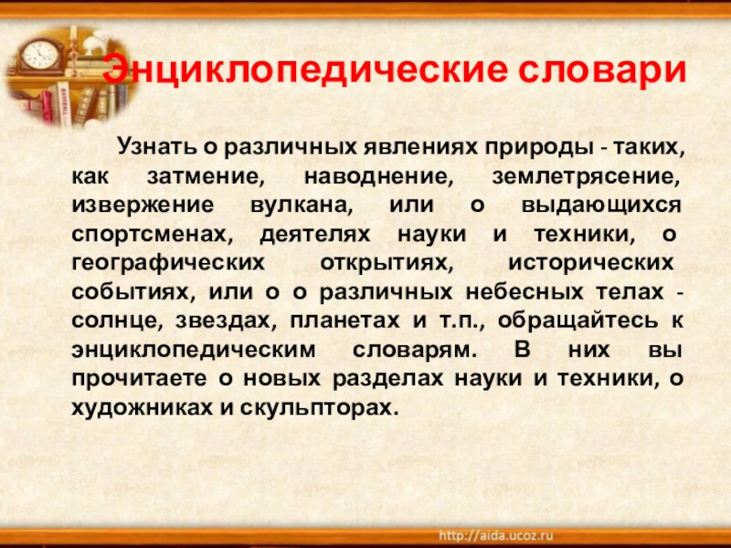 землетрясение, извержение вулкана, или о выдающихся спортсменах, деятелях науки и техники, о географических открытиях, исторических событиях, или о о различных небесных телах - солнце, звездах, планетах и т.п., обращайтесь к энциклопедическим словарям. В них вы прочитаете о новых разделах науки и техники, о художниках и скульпторах.