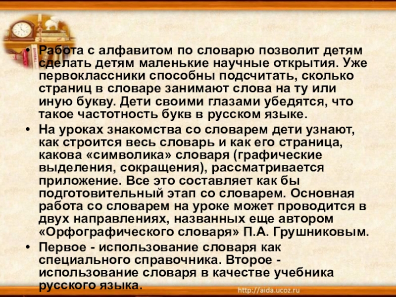 На уроках знакомства со словарем дети узнают, как строится весь словарь и как его страница, какова «символика» словаря (графические выделения, сокращения), рассматривается приложение. Все это составляет как бы подготовительный этап со словарем. Основная работа со словарем на уроке может проводится в двух направлениях, названных еще автором «Орфографического словаря» П.А. Грушниковым.