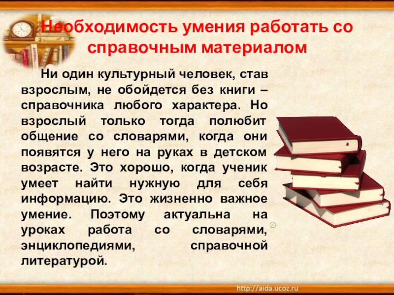 не обойдется без книги – справочника любого характера. Но взрослый только тогда полюбит общение со словарями, когда они появятся у него на руках в детском возрасте. Это хорошо, когда ученик умеет найти нужную для себя информацию. Это жизненно важное умение. Поэтому актуальна на уроках работа со словарями, энциклопедиями, справочной литературой.