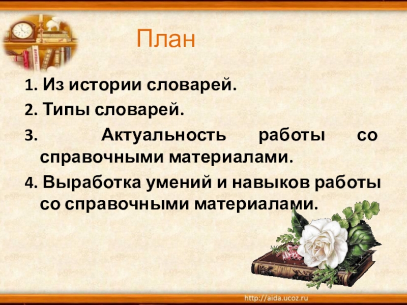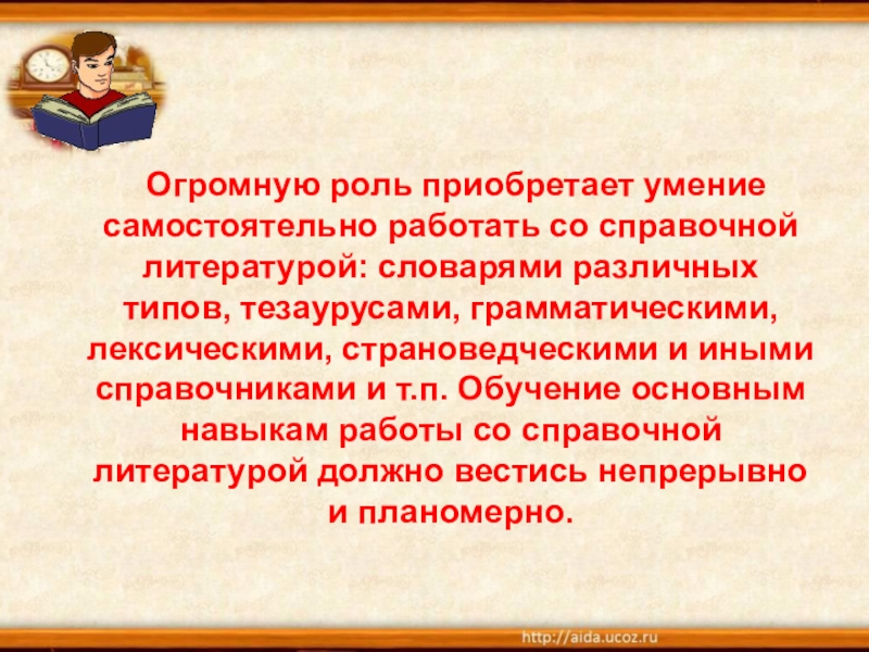 типов, тезаурусами, грамматическими, лексическими, страноведческими и иными справочниками и т.п. Обучение основным навыкам работы со справочной литературой должно вестись непрерывно и планомерно.