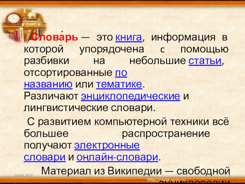 Слайд 4 Слова́рь — это книга, информация в которой упорядочена c помощью разбивки