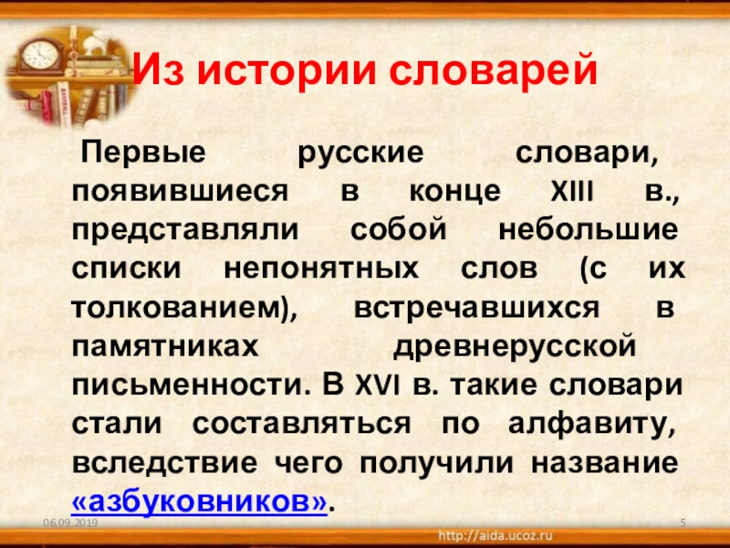 XIII в., представляли собой небольшие списки непонятных слов (с их толкованием), встречавшихся в памятниках древнерусской письменности. В XVI в. такие словари стали составляться по алфавиту, вследствие чего получили название «азбуковников».