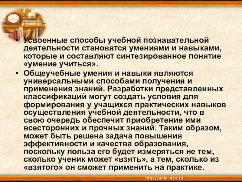 Слайд 19Усвоенные способы учебной познавательной деятельности становятся умениями и навыками, которые и