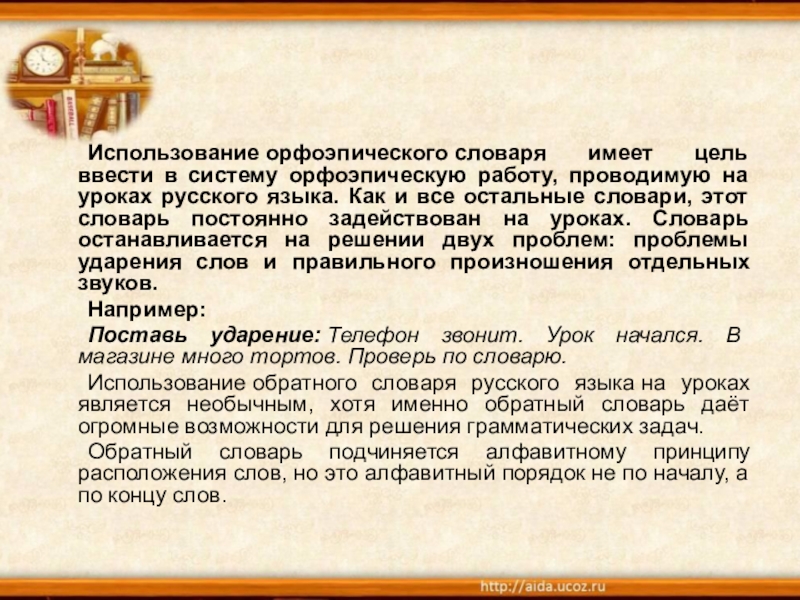 Слайд 23 Использование орфоэпического словаря имеет цель ввести в систему орфоэпическую работу, проводимую на уроках