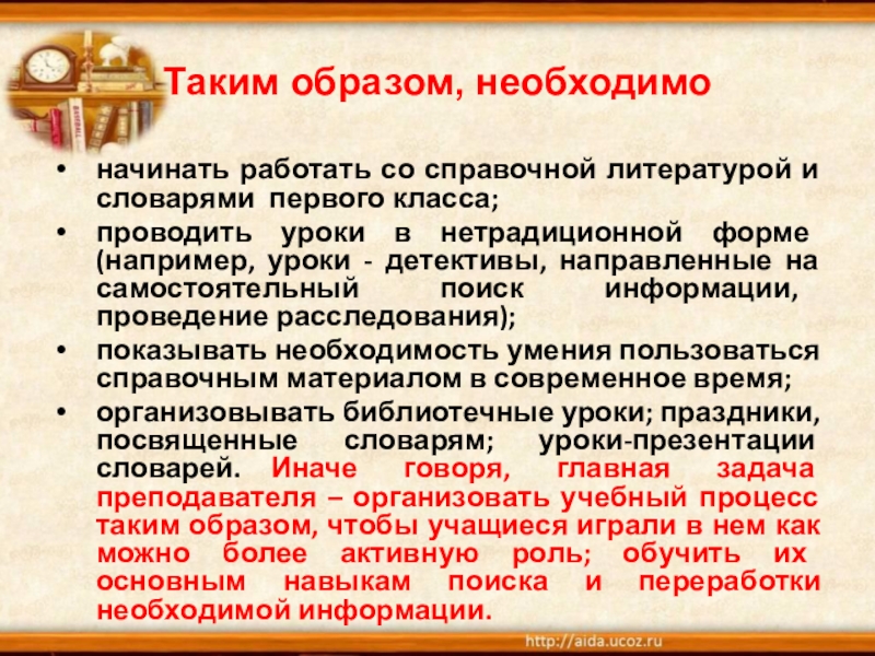 организовывать библиотечные уроки; праздники, посвященные словарям; уроки-презентации словарей. Иначе говоря, главная задача преподавателя – организовать учебный процесс таким образом, чтобы учащиеся играли в нем как можно более активную роль; обучить их основным навыкам поиска и переработки необходимой информации.