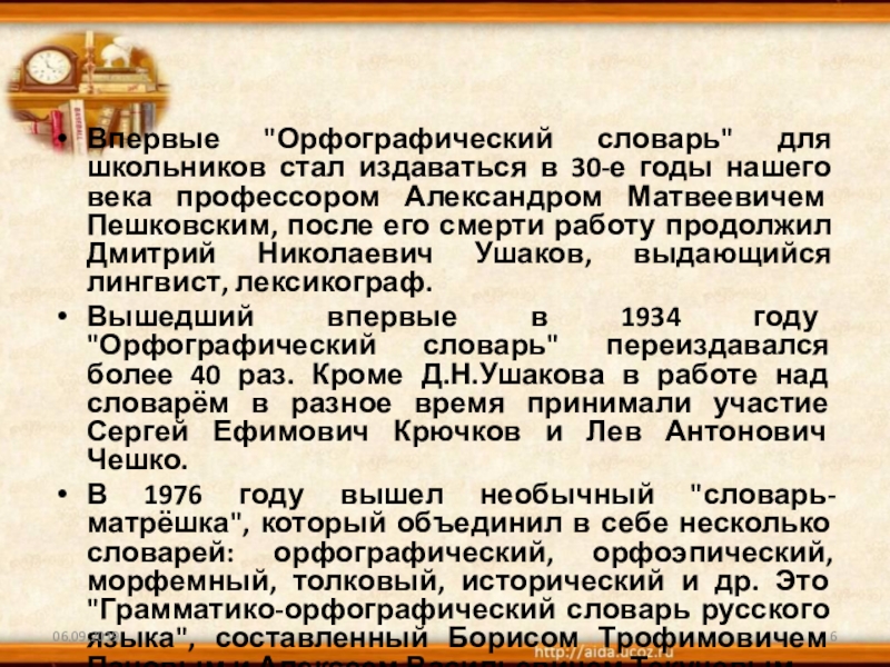Вышедший впервые в 1934 году "Орфографический словарь" переиздавался более 40 раз. Кроме Д.Н.Ушакова в работе над словарём в разное время принимали участие Сергей Ефимович Крючков и Лев Антонович Чешко.