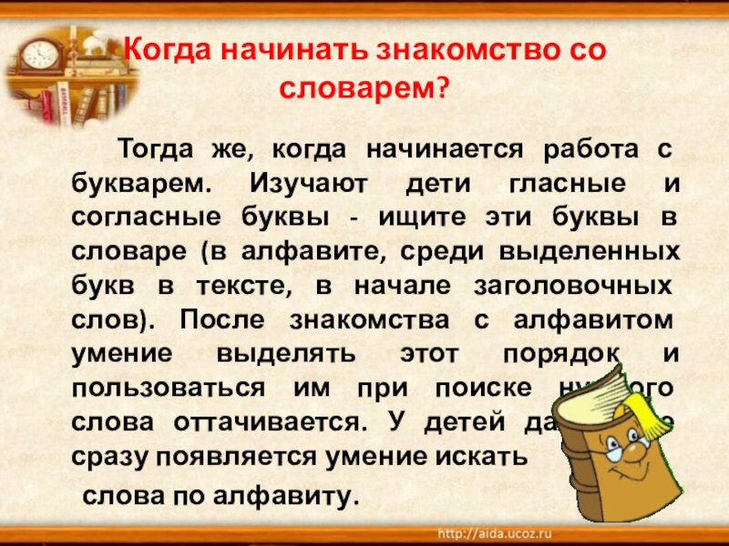 Изучают дети гласные и согласные буквы - ищите эти буквы в словаре (в алфавите, среди выделенных букв в тексте, в начале заголовочных слов). После знакомства с алфавитом умение выделять этот порядок и пользоваться им при поиске нужного слова оттачивается. У детей далеко не сразу появляется умение искать