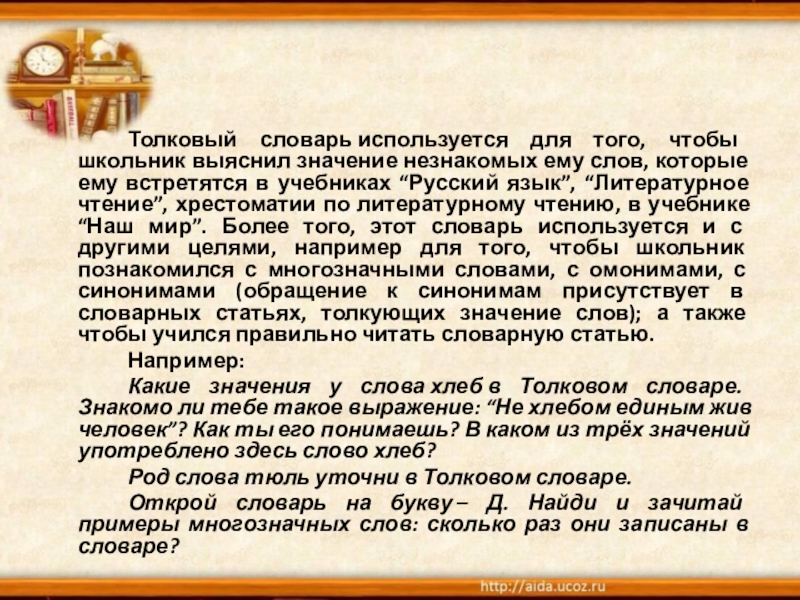 Толковый словарь используется для того, чтобы школьник выяснил значение незнакомых ему слов,