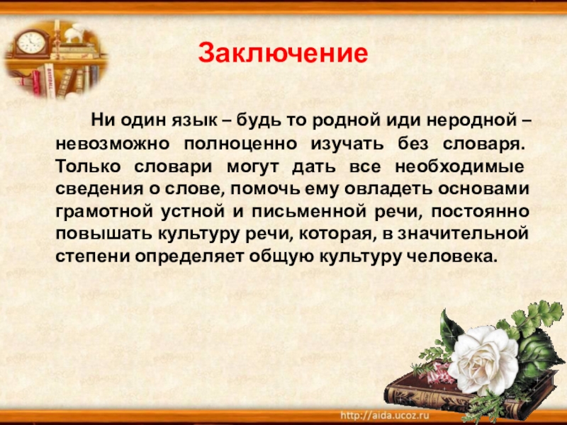 полноценно изучать без словаря. Только словари могут дать все необходимые сведения о слове, помочь ему овладеть основами грамотной устной и письменной речи, постоянно повышать культуру речи, которая, в значительной степени определяет общую культуру человека.