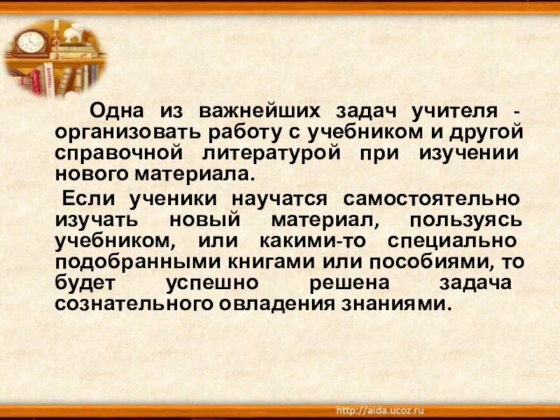 Если ученики научатся самостоятельно изучать новый материал, пользуясь учебником, или какими-то специально подобранными книгами или пособиями, то будет успешно решена задача сознательного овладения знаниями.