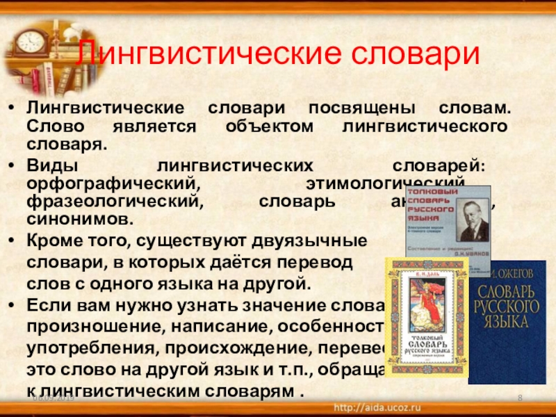 на небольшие статьи, отсортированные по названию или тематике. Различают энциклопедические и лингвистические словари.