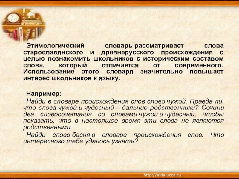Слайд 22 Этимологический словарь рассматривает слова старославянского и древнерусского происхождения с целью познакомить школьников