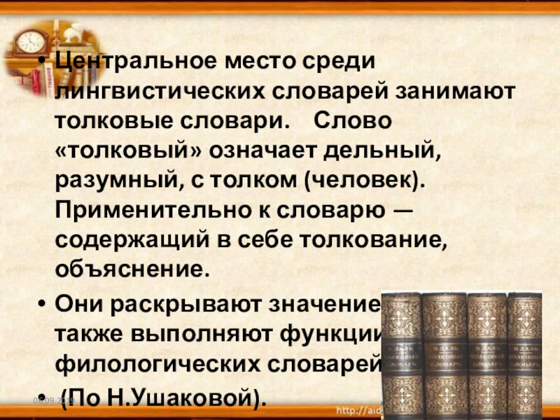 Слайд 9Центральное место среди лингвистических словарей занимают толковые словари. Слово «толковый» означает