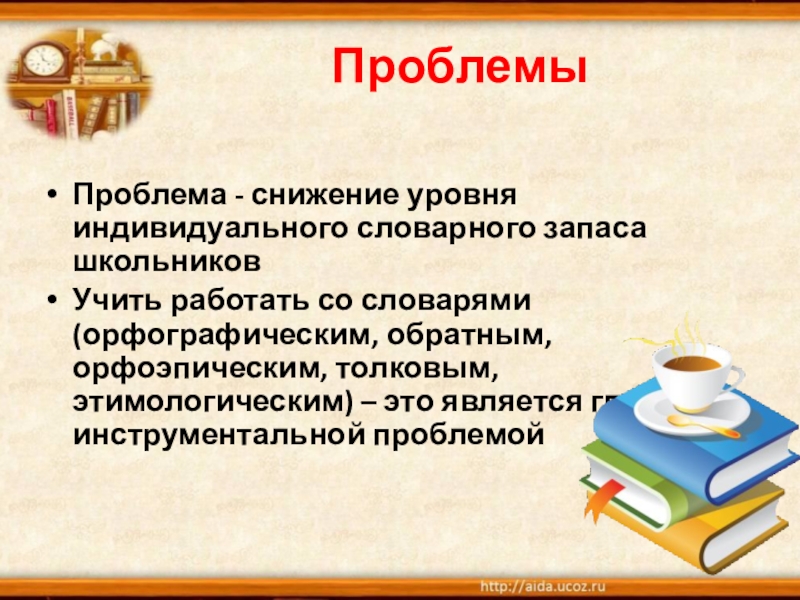 Учить работать со словарями (орфографическим, обратным, орфоэпическим, толковым, этимологическим) – это является главной инструментальной проблемой