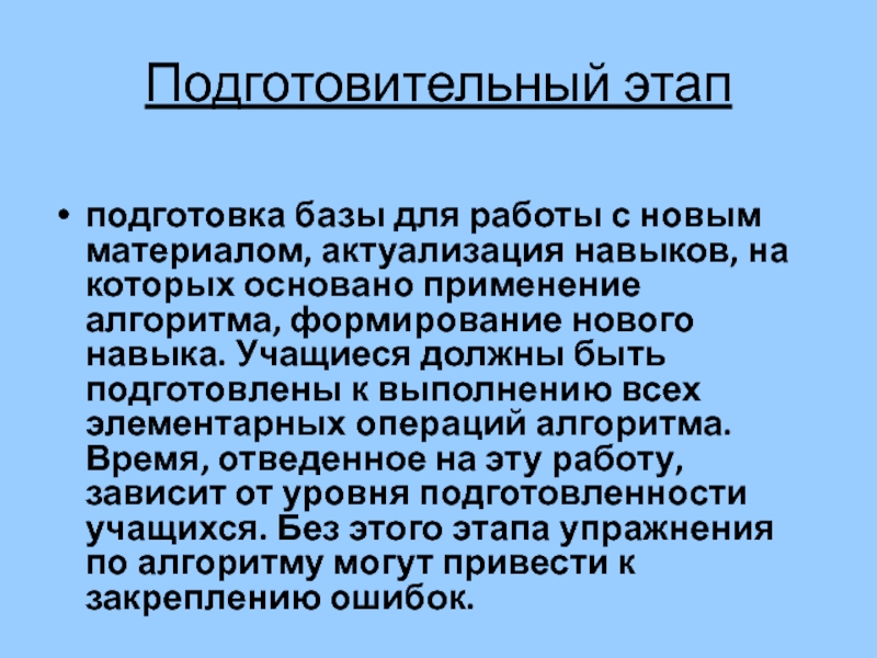 которых основано применение алгоритма, формирование нового навыка. Учащиеся должны быть подготовлены к выполнению всех элементарных операций алгоритма. Время, отведенное на эту работу, зависит от уровня подготовленности учащихся. Без этого этапа упражнения по алгоритму могут привести к закреплению ошибок.