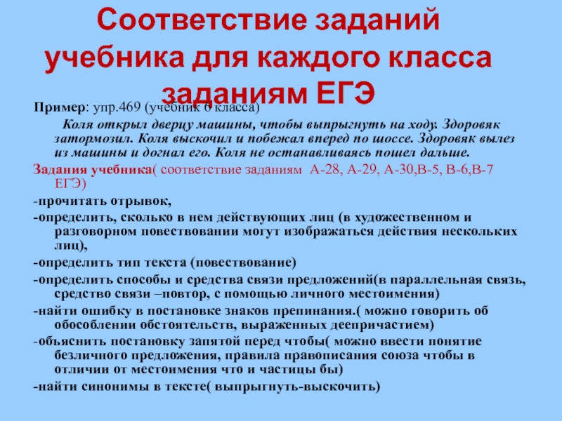 Слайд 6Соответствие заданий учебника для каждого класса заданиям ЕГЭ