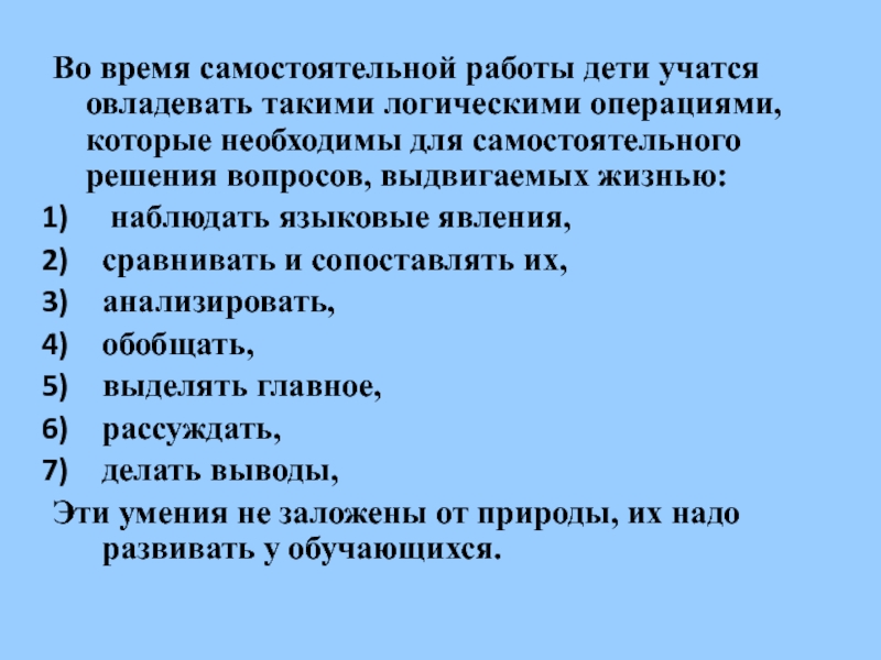 Слайд 8Во время самостоятельной работы дети учатся овладевать такими логическими операциями, которые