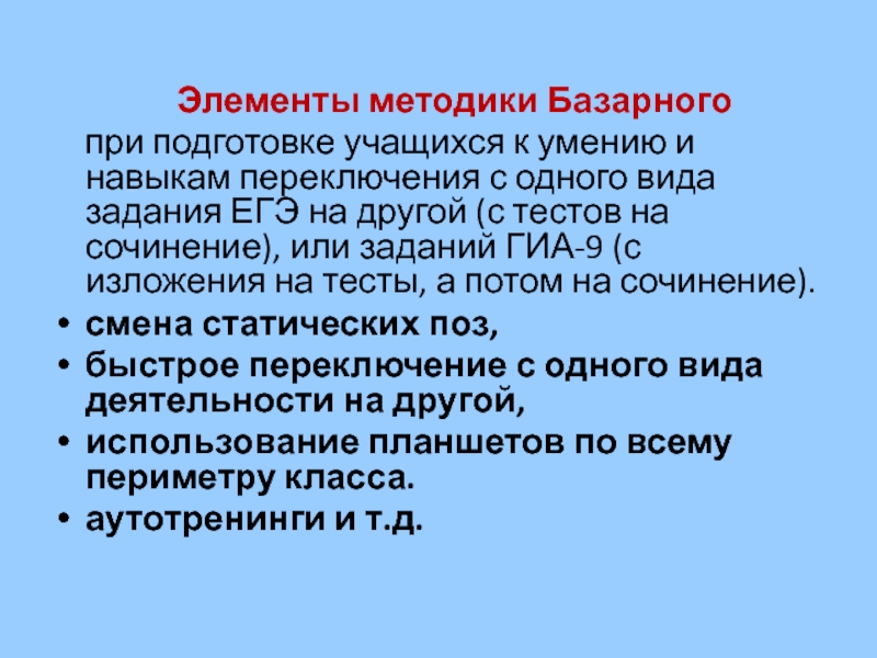 умению и навыкам переключения с одного вида задания ЕГЭ на другой (с тестов на сочинение), или заданий ГИА-9 (с изложения на тесты, а потом на сочинение).