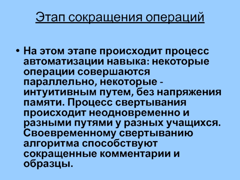 совершаются параллельно, некоторые - интуитивным путем, без напряжения памяти. Процесс свертывания происходит неодновременно и разными путями у разных учащихся. Своевременному свертыванию алгоритма способствуют сокращенные комментарии и образцы.