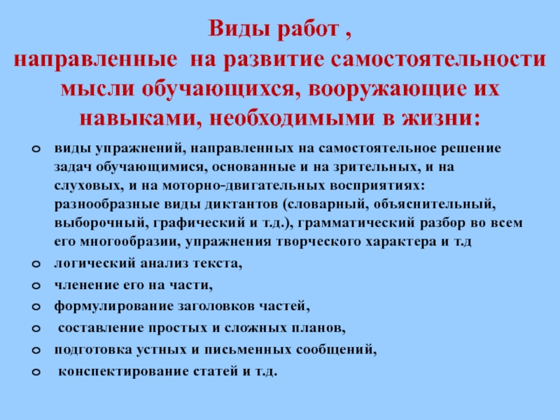 виды упражнений, направленных на самостоятельное решение задач обучающимися, основанные и на зрительных, и на слуховых, и на моторно-двигательных восприятиях: разнообразные виды диктантов (словарный, объяснительный, выборочный, графический и т.д.), грамматический разбор во всем его многообразии, упражнения творческого характера и т.д