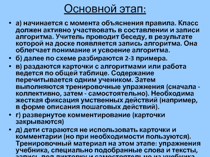 в) раздаются карточки с алгоритмами или работа ведется по общей таблице. Содержание перечитывается одним учеником. Затем выполняются тренировочные упражнения (сначала - коллективно, затем - самостоятельно). Необходима жесткая фиксация умственных действий (например, в форме описания пошаговых действий).