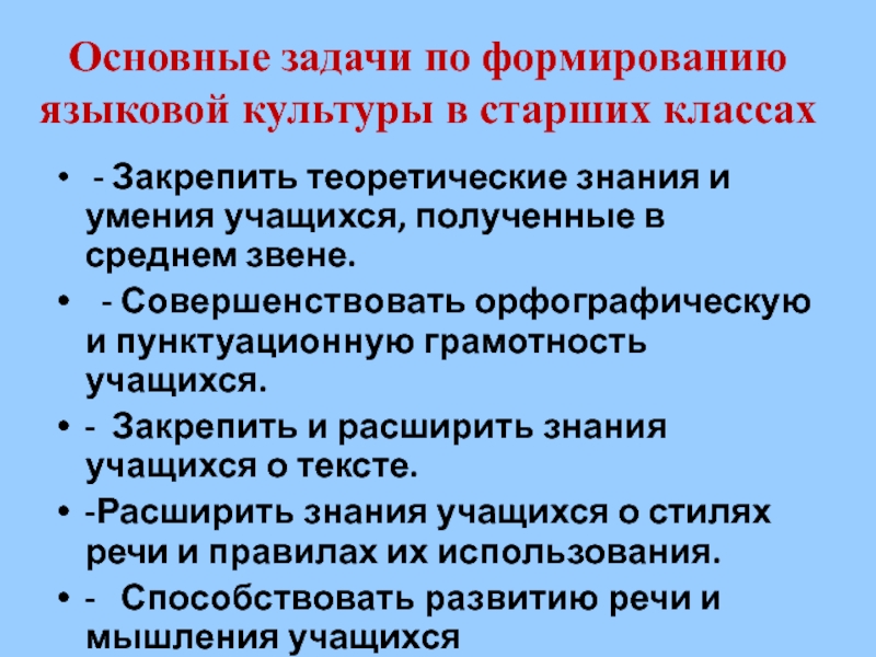 Слайд 7Основные задачи по формированию языковой культуры в старших классах