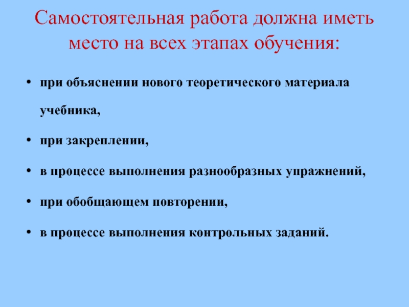 Слайд 11Самостоятельная работа должна иметь место на всех этапах обучения: