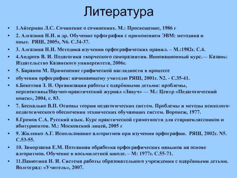10. Заморзаева Е.М. Поэтапная обработка орфографических навыков на основе алгоритмов. Обучение в восьмилетней школе. – М: 1977г. С.55-71.