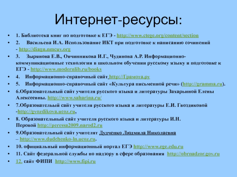 3. Зырянова Е.В., Овчинникова И.Г., Чудинова А.Р. Информационно-коммуникационные технологии в школьном обучении русскому языку и подготовке к ЕГЭ - http://www.modernlib.ru/books