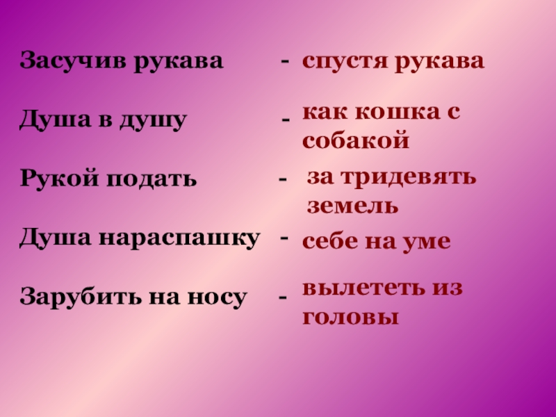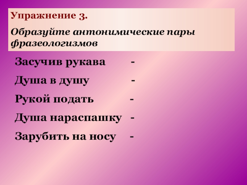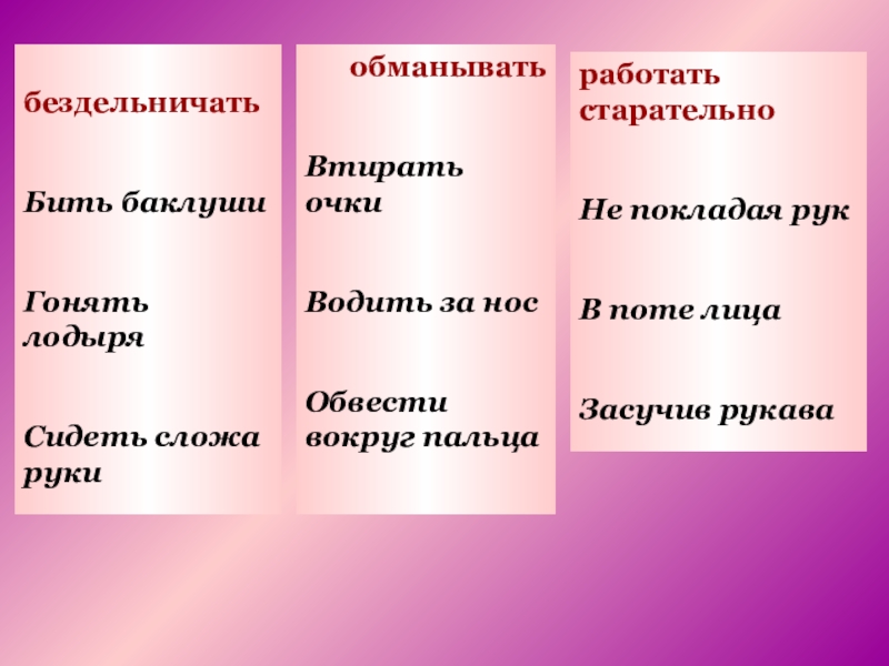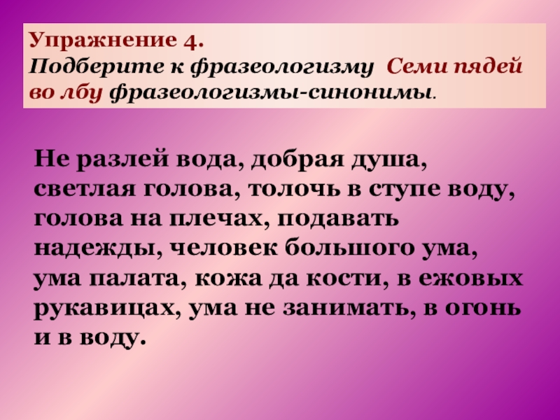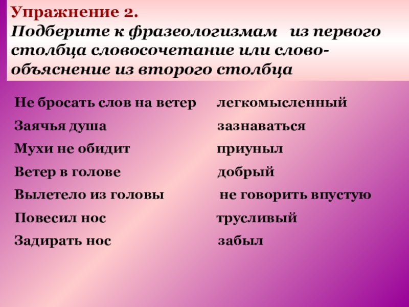 Упражнение 2. Подберите к фразеологизмам из первого столбца словосочетание или слово-объяснение из второго столбца