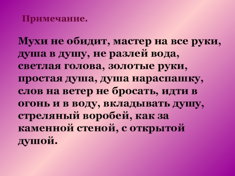 Не разлей вода, добрая душа, светлая голова, толочь в ступе воду, голова на плечах, подавать надежды, человек большого ума, ума палата, кожа да кости, в ежовых рукавицах, ума не занимать, в огонь и в воду.
