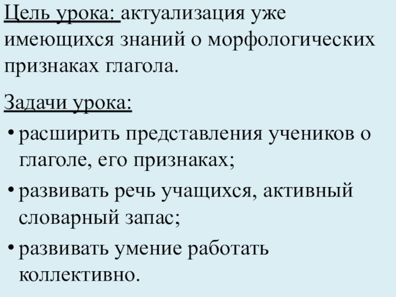 Слайд 3Цель урока: актуализация уже имеющихся знаний о морфологических признаках глагола.