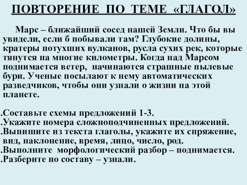 Выпишите из текста глаголы, укажите их спряжение, вид, наклонение, время, лицо, число, род.