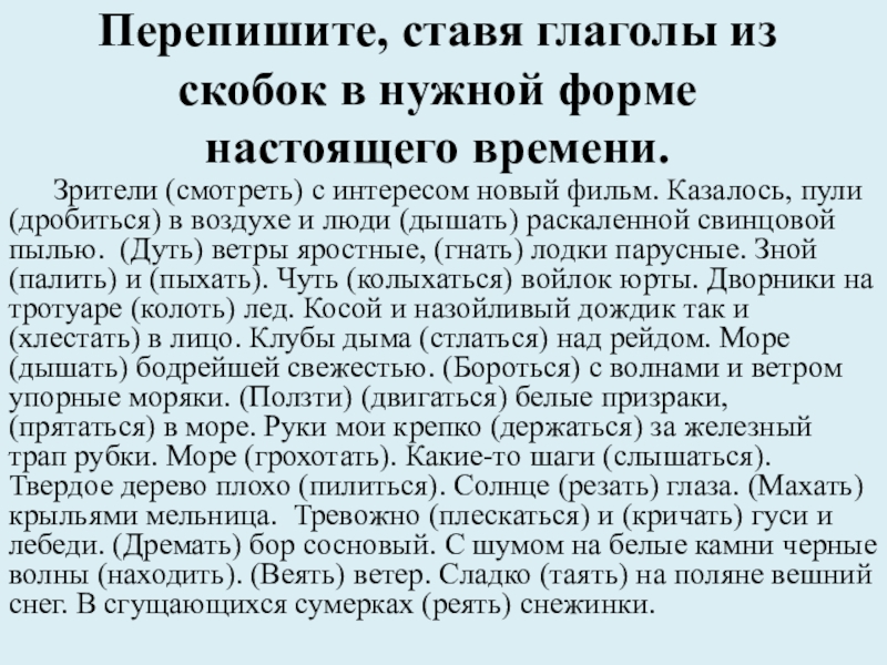с интересом новый фильм. Казалось, пули (дробиться) в воздухе и люди (дышать) раскаленной свинцовой пылью. (Дуть) ветры яростные, (гнать) лодки парусные. Зной (палить) и (пыхать). Чуть (колыхаться) войлок юрты. Дворники на тротуаре (колоть) лед. Косой и назойливый дождик так и (хлестать) в лицо. Клубы дыма (стлаться) над рейдом. Море (дышать) бодрейшей свежестью. (Бороться) с волнами и ветром упорные моряки. (Ползти) (двигаться) белые призраки, (прятаться) в море. Руки мои крепко (держаться) за железный трап рубки. Море (грохотать). Какие-то шаги (слышаться). Твердое дерево плохо (пилиться). Солнце (резать) глаза. (Махать) крыльями мельница. Тревожно (плескаться) и (кричать) гуси и лебеди. (Дремать) бор сосновый. С шумом на белые камни черные волны (находить). (Веять) ветер. Сладко (таять) на поляне вешний снег. В сгущающихся сумерках (реять) снежинки.