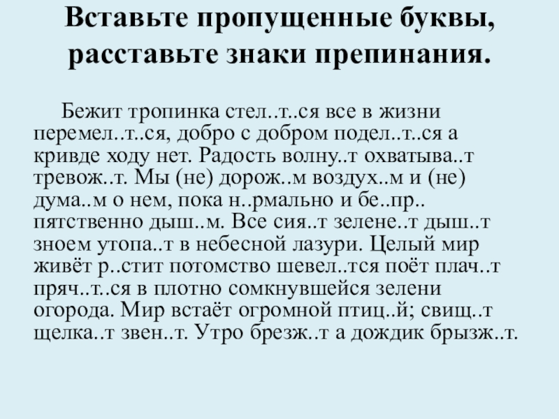 перемел..т..ся, добро с добром подел..т..ся а кривде ходу нет. Радость волну..т охватыва..т тревож..т. Мы (не) дорож..м воздух..м и (не) дума..м о нем, пока н..рмально и бе..пр..пятственно дыш..м. Все сия..т зелене..т дыш..т зноем утопа..т в небесной лазури. Целый мир живёт р..стит потомство шевел..тся поёт плач..т пряч..т..ся в плотно сомкнувшейся зелени огорода. Мир встаёт огромной птиц..й; свищ..т щелка..т звен..т. Утро брезж..т а дождик брызж..т.