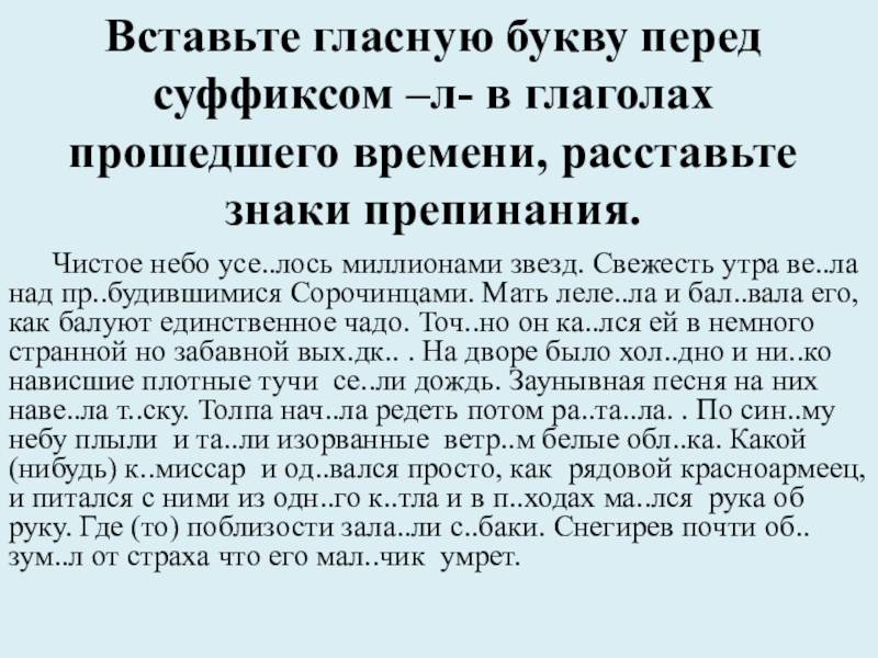Чистое небо усе..лось миллионами звезд. Свежесть утра ве..ла над пр..будившимися Сорочинцами. Мать леле..ла и бал..вала его, как балуют единственное чадо. Точ..но он ка..лся ей в немного странной но забавной вых.дк.. . На дворе было хол..дно и ни..ко нависшие плотные тучи се..ли дождь. Заунывная песня на них наве..ла т..ску. Толпа нач..ла редеть потом ра..та..ла. . По син..му небу плыли и та..ли изорванные ветр..м белые обл..ка. Какой (нибудь) к..миссар и од..вался просто, как рядовой красноармеец, и питался с ними из одн..го к..тла и в п..ходах ма..лся рука об руку. Где (то) поблизости зала..ли с..баки. Снегирев почти об..зум..л от страха что его мал..чик умрет.