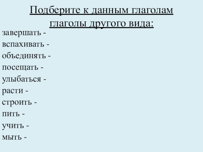 Слайд 34Подберите к данным глаголам глаголы другого вида: