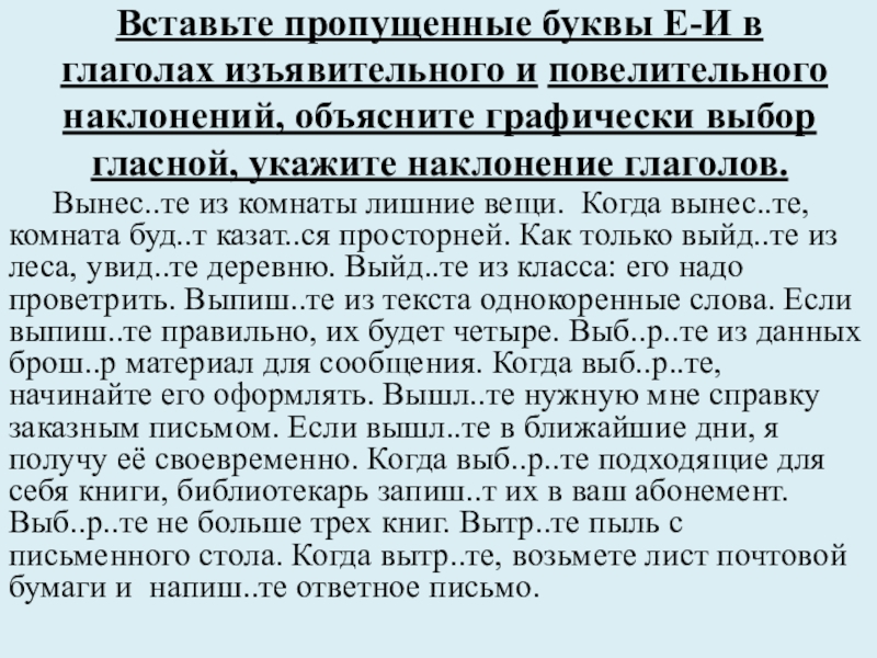 Вынес..те из комнаты лишние вещи. Когда вынес..те, комната буд..т казат..ся просторней. Как только выйд..те из леса, увид..те деревню. Выйд..те из класса: его надо проветрить. Выпиш..те из текста однокоренные слова. Если выпиш..те правильно, их будет четыре. Выб..р..те из данных брош..р материал для сообщения. Когда выб..р..те, начинайте его оформлять. Вышл..те нужную мне справку заказным письмом. Если вышл..те в ближайшие дни, я получу её своевременно. Когда выб..р..те подходящие для себя книги, библиотекарь запиш..т их в ваш абонемент. Выб..р..те не больше трех книг. Вытр..те пыль с письменного стола. Когда вытр..те, возьмете лист почтовой бумаги и напиш..те ответное письмо.
