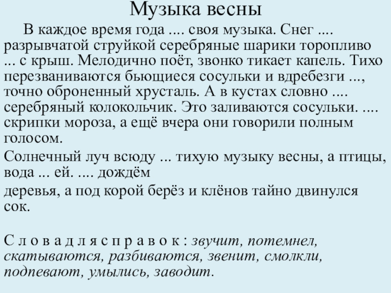 струйкой серебряные шарики торопливо ... с крыш. Мелодично поёт, звонко тикает капель. Тихо перезваниваются бьющиеся сосульки и вдребезги ..., точно оброненный хрусталь. А в кустах словно .... серебряный колокольчик. Это заливаются сосульки. .... скрипки мороза, а ещё вчера они говорили полным голосом.