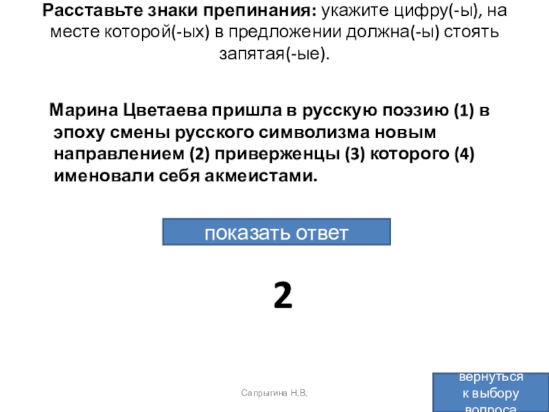 Марина Цветаева пришла в русскую поэзию (1) в эпоху смены русского символизма новым направлением (2) приверженцы (3) которого (4) именовали себя акмеистами.