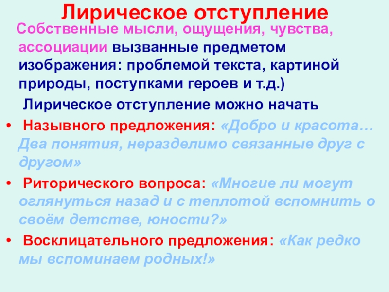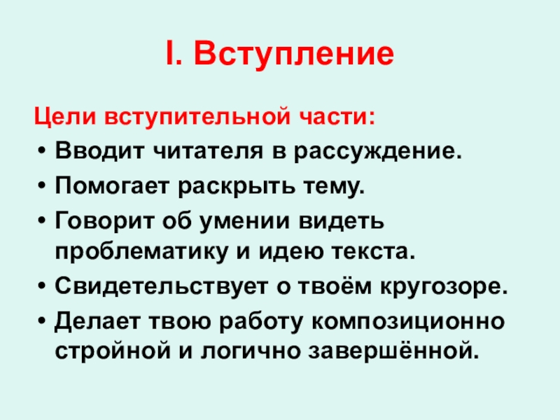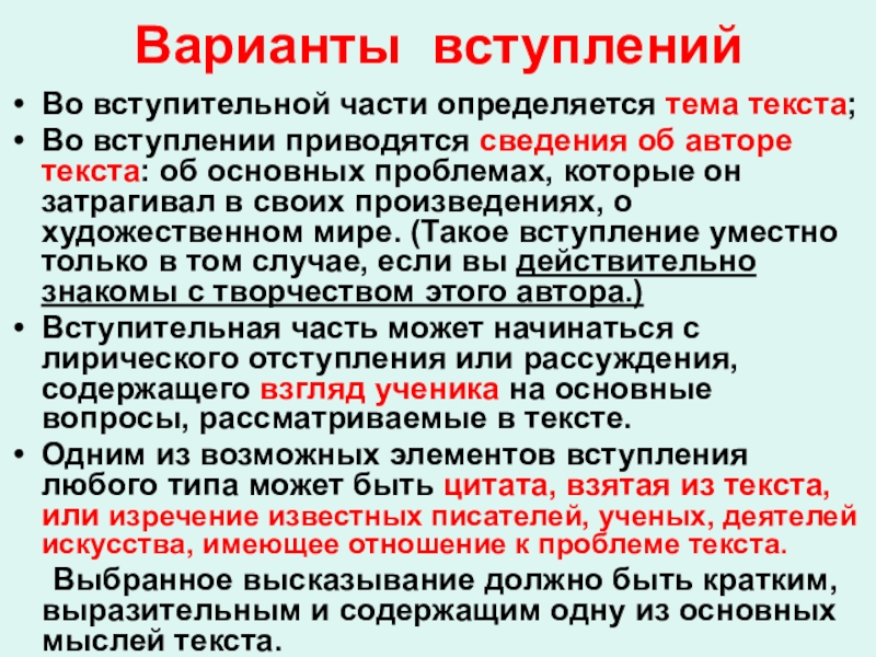 Вступительная часть может начинаться с лирического отступления или рассуждения, содержащего взгляд ученика на основные вопросы, рассматриваемые в тексте.