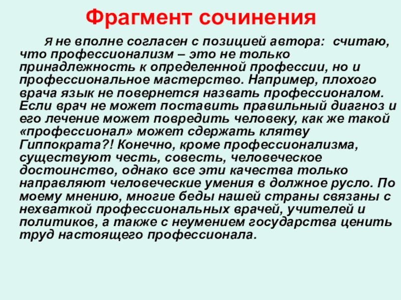 что профессионализм – это не только принадлежность к определенной профессии, но и профессиональное мастерство. Например, плохого врача язык не повернется назвать профессионалом. Если врач не может поставить правильный диагноз и его лечение может повредить человеку, как же такой «профессионал» может сдержать клятву Гиппократа?! Конечно, кроме профессионализма, существуют честь, совесть, человеческое достоинство, однако все эти качества только направляют человеческие умения в должное русло. По моему мнению, многие беды нашей страны связаны с нехваткой профессиональных врачей, учителей и политиков, а также с неумением государства ценить труд настоящего профессионала.