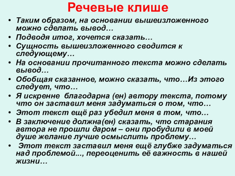 Обобщая сказанное, можно сказать, что…Из этого следует, что…