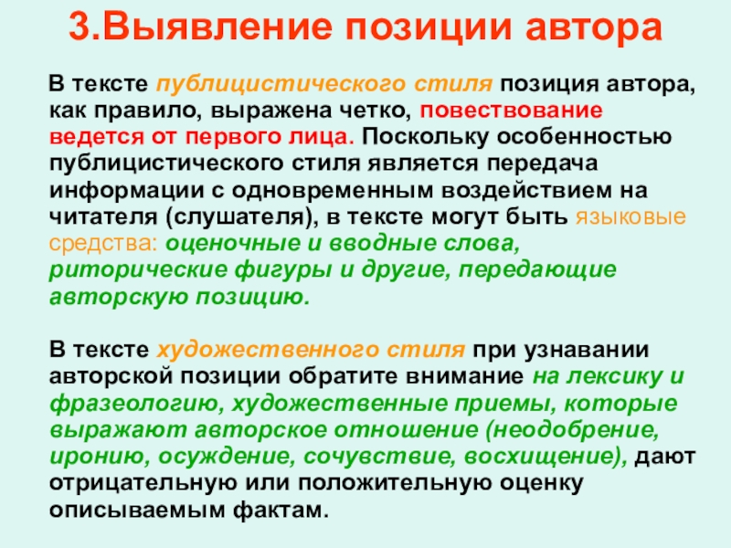 Нельзя не заметить авторскую позицию в использованных оценочных словах, сравнительных оборотах, риторических восклицаниях и т.п.