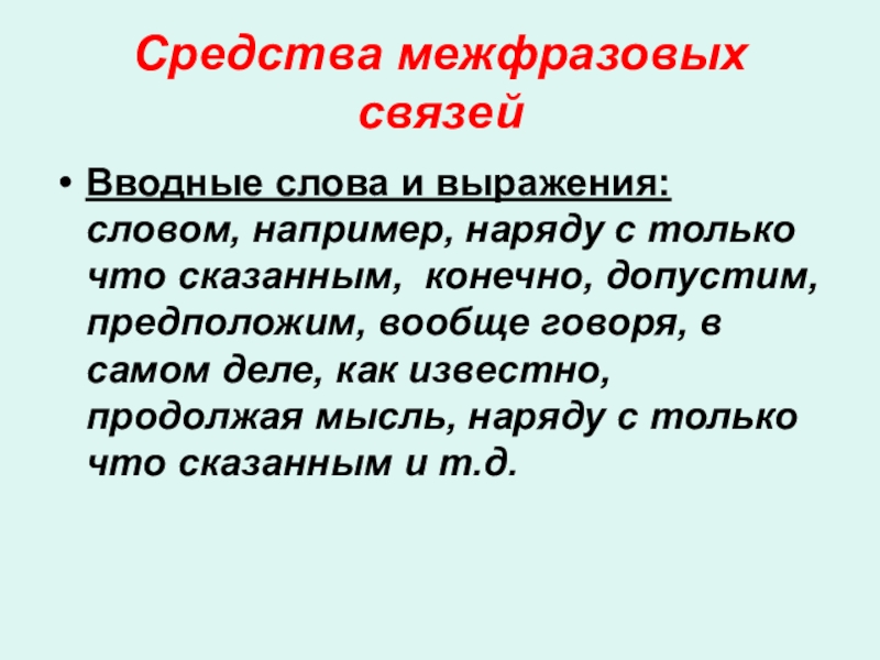 что сказанным, конечно, допустим, предположим, вообще говоря, в самом деле, как известно, продолжая мысль, наряду с только что сказанным и т.д.