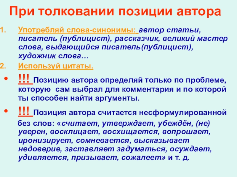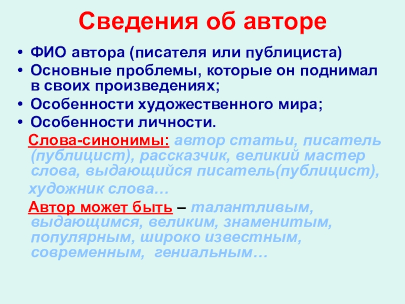 Слова-синонимы: автор статьи, писатель (публицист), рассказчик, великий мастер слова, выдающийся писатель(публицист),