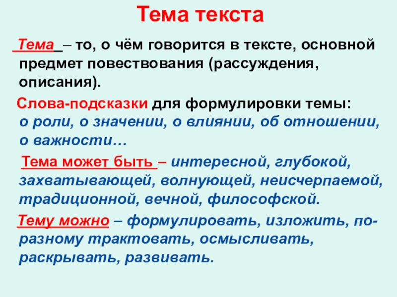Тему можно – формулировать, изложить, по-разному трактовать, осмысливать, раскрывать, развивать.
