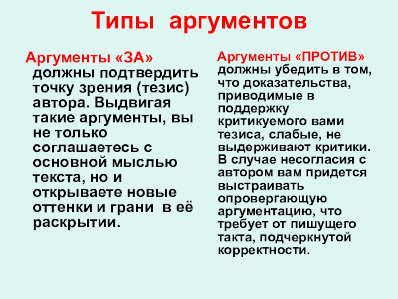 Аргументы «ПРОТИВ» должны убедить в том, что доказательства, приводимые в поддержку критикуемого вами тезиса, слабые, не выдерживают критики. В случае несогласия с автором вам придется выстраивать опровергающую аргументацию, что требует от пишущего такта, подчеркнутой корректности.