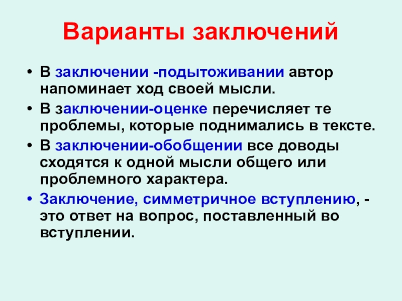 В заключении -подытоживании автор напоминает ход своей мысли.