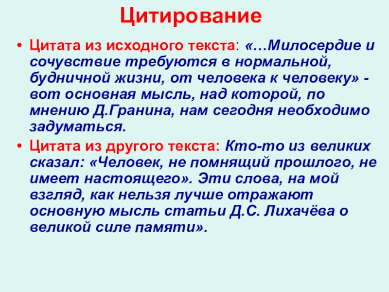 Цитата из другого текста: Кто-то из великих сказал: «Человек, не помнящий прошлого, не имеет настоящего». Эти слова, на мой взгляд, как нельзя лучше отражают основную мысль статьи Д.С. Лихачёва о великой силе памяти».